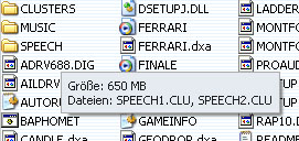 Schaut man nun in den Spiel-Ordner sieht man, dass manche Dateinamen dreimal vorhanden sind - wie z.B. 'intro'. Diese liegt nun im Ordner als 'intro.dxa', 'intro.fla', sowie 'intro.ogg' vor. Bei sämtlichen Dateien, wo dies der Fall ist (betrifft außerdem die Dateien credits, ferrari, finale, history) kann die *.fla-Datei gelöscht werden (hier: 'Intro.fla').