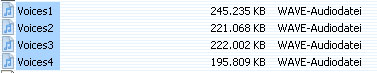 Damit 'Floyd - Es gibt noch Helden' problemlos unter 'ScummVM' funktioniert, müssen die Daten der insgesamt vier CDs in einen gemeinsamen Ordner kopiert werden. Der Ordner 'DirectX' kann dabei jedoch getrost vernachlässigt werden. Wichtig: Nachdem der Inhalt der ersten CD kopiert ist, muss man, BEVOR man mit den Inhalt der zweiten CD fortfahren möchte, die Datei 'Voices.wav' in 'Voices1.wav' unbenennen. Nachdem der Inhalt der zweiten CD in den Spiel-Ordner transferiert wurde, benennt man die dort wiederum neu angelegte Datei 'Voices.wav' in 'Voices2.wav' um. Diese Numerierung führt man bei allen vier CDs durch, so dass sich letzten Endes im Spiel-Ordner, neben den eigentlichen Dateien des Adventures, die Voices-Dateien #1-4 - wie im folgenden Screenshot ersichtlich ist - befinden. Sämtliche anderen Dateien, können problemlos überschrieben werden, sollten sie denn doppelt vorkommen.