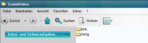 Nach der Installation legen wir auf der Partition C: (erste Partition) einen Ordner mit Namen 'ScummVideos' (C:ScummVideos) an. Darin erstellen wir zwei weitere Ordner, die wir zum einen mit 'fertig' und 'bink' bezeichnen.
