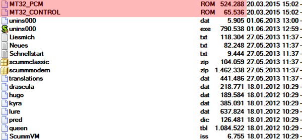 Aufgrund rechtlicher Zusammenhänge ist es leider nicht möglich, die beiden notwendigen Dateien - MT32_PCM.ROM und MT32_CONTROL.ROM auf unseren Seiten direkt zum Download anzubieten. Im Multi-Plattform-Synthesizer-Projekt 'Munt' sind die Dateien allerdings legal und kostenlos bereits enthalten. Des Weiteren finden sich im ScummVM-Forum einige weitere Quellen für die Dateien.