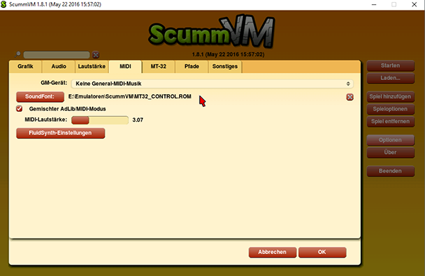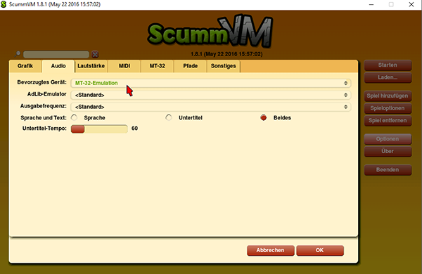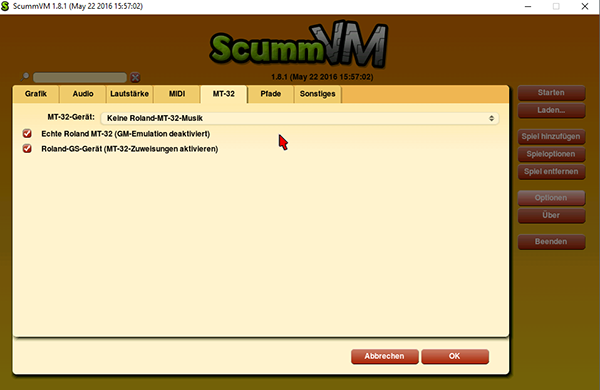 Wir empfehlen möglichst die aktuellste Version von 'ScummVM' zu verwenden, da die Soundemulation der Roland-MT32 stetig verbessert wird und Ihr damit das qualitativ beste Ergebnis erzielt.