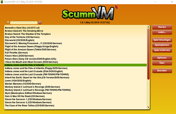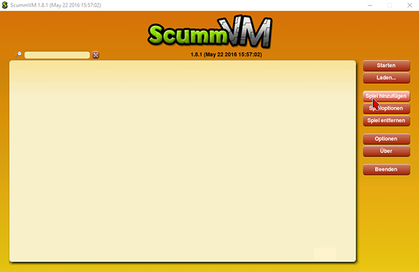 Ist die Installation abgeschlossen, kann 'ScummVM' sofort gestartet werden. Ein Reboot des Rechners ist nicht erforderlich. Nach dem Start sollte man folgenden Bildschirm vor sich sehen: