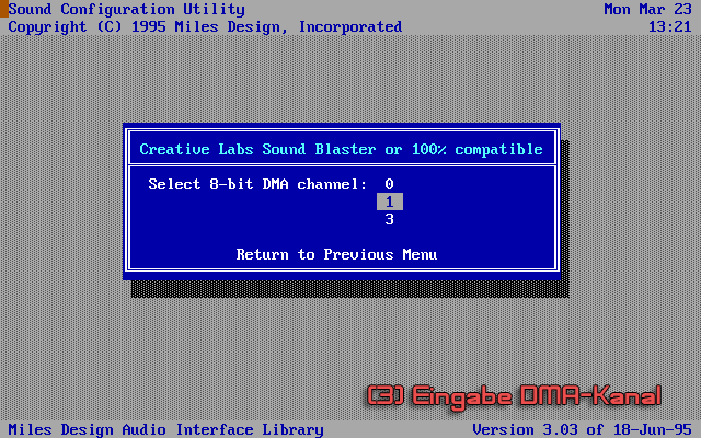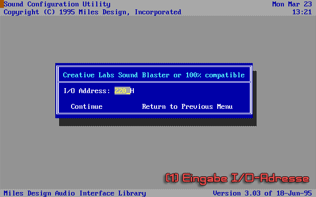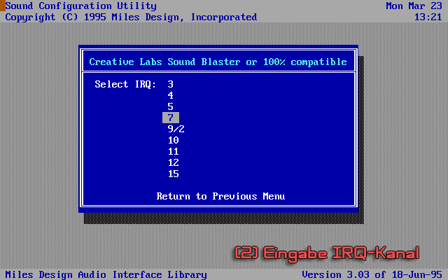 Während einer Installations oder Konfiguration wird man nach dem Typ der Soundkarte und ihren dazugehörigen I/O-, IRQ- und DMA-Kanälen gefragt. Dieses Vorgehen ist bei fast allen Spielen beinahe identisch.