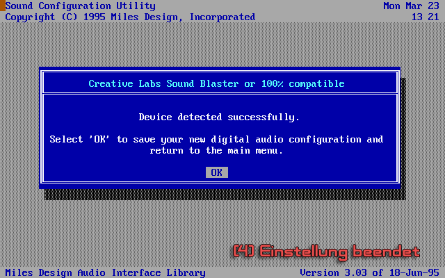 Zu Beginn muss die richtige Soundkarte ausgewählt werden. Oft werden, wie im unteren Screenshot dargestellt, Gerätelisten verwendet, mit denen man sich mittels der Corsur-Tasten nach oben und unten bewegen kann. Dort wählt man die Soundkarte 'Creative Labs Sound Blaster or 100% compatible' und bestätigt die Auswahl mit Return.